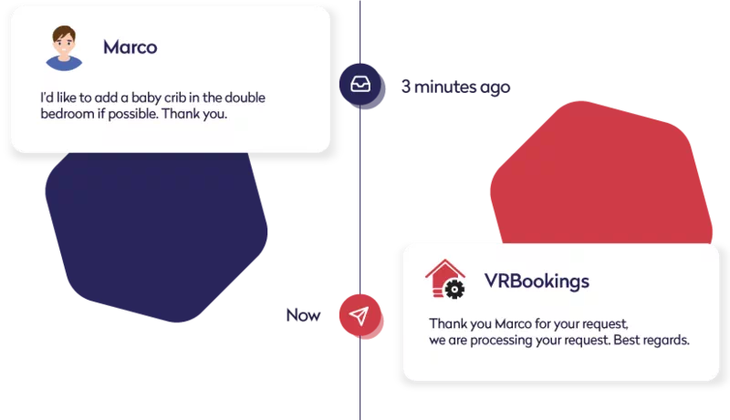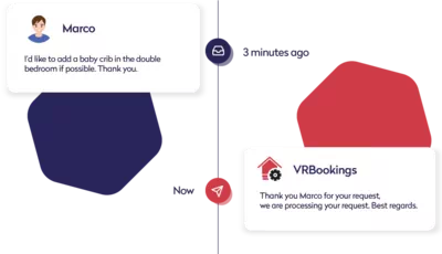 Perché sprecare tempo prezioso? Con i messaggi automatici di VRBookings invii risposte automatiche, notifiche tempestive e remind e follow-up: che si tratti di inviare solleciti di pagamento, confermare le prenotazioni o coordinare gli arrivi, VRBookings consente di automatizzare tutte le comunicazioni per la gestione ottimale delle tue case vacanza. Tutti i messaggi automatici e gli eventi possono essere personalizzati in base alle proprie preferenze, garantendo coerenza e risposte tempestive e rendendo la gestione delle vostre case vacanza sempre più efficiente e allo stesso tempo gli ospiti e i proprietari più soddisfatti.